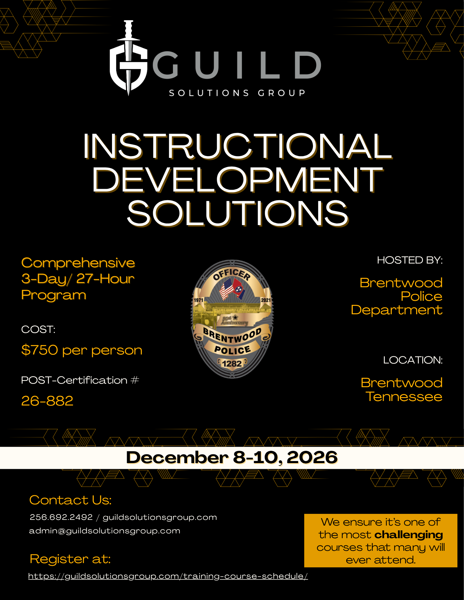 Instructional Development Solutions is a unique three (3) day personal growth and development course that focuses on creation, delivery, follow-up, and documentation of instruction. It’s open to all individuals, but specifically catered to First Responders, the Military, and Government Personnel.